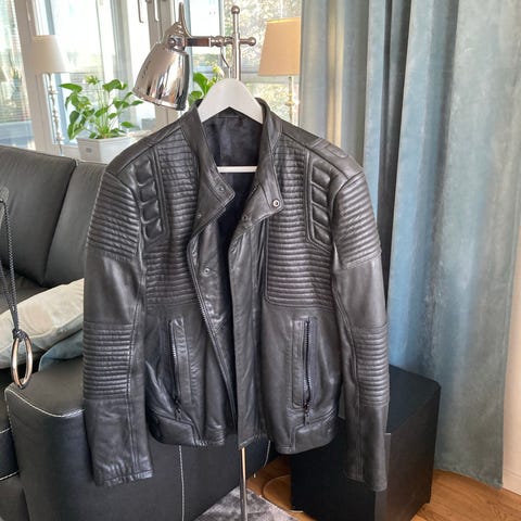 Hugo Boss skinnjacka för herr i storlek M. Jackan är vit och tillverkad i läder med kort modell. Den har dragkedja framtill, bröstficka med dragkedja samt sidofickor. Invändigt finns ljus fodring med kontrasterande röda detaljer och innerfickor med dragkedja. Passar som ytterjacka i mildare väder.