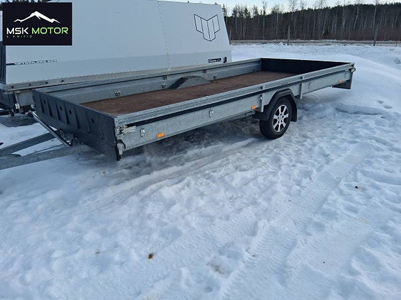 Här får du tre släpvagnar i ett. Tippvagn, liten "godsvagn" och timmervagn. Utmärkt för jakt och transport av älg.