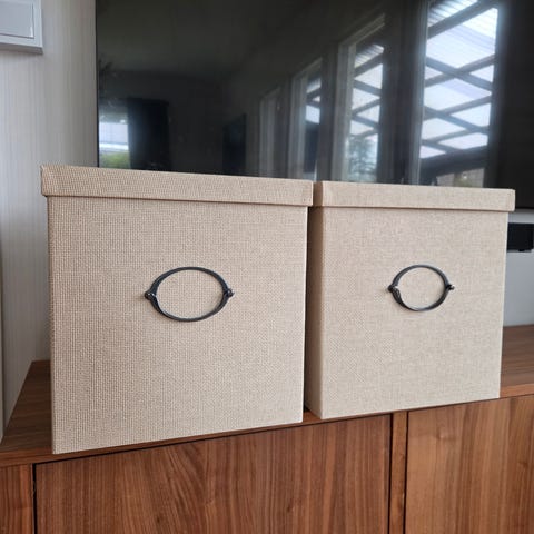 Jysk förvaringskorgar i flätat naturmaterial. Två kvadratiska korgar med handtag på kortsidorna .