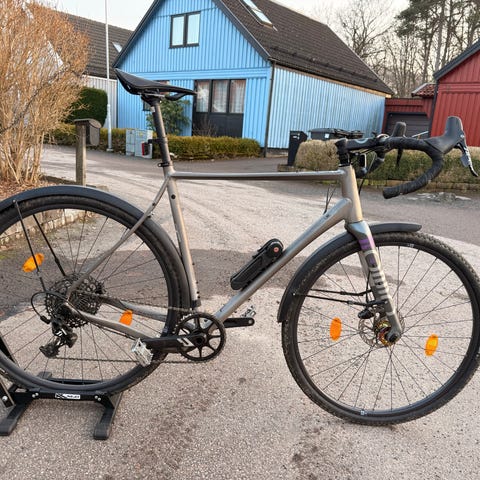 Allebike Rocket AXS. Gravelcykel i storlek S (stor i storleken). Jag är 174 cm, långa armar, korta ben och sitter som på bilden med 80mm styrstam.