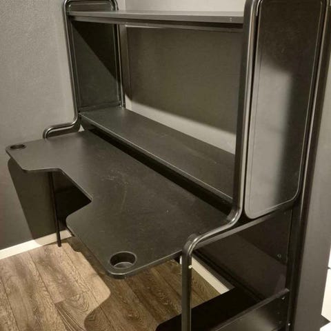 Fredde skrivbord för gaming. Färgen är svart. Från IKEA. Sidohyllorna finns inte. Se min bild hur vårat skrivbord ser ut för att se vilka delar som inte finns. Skrivbordet är i fint och bra skick.