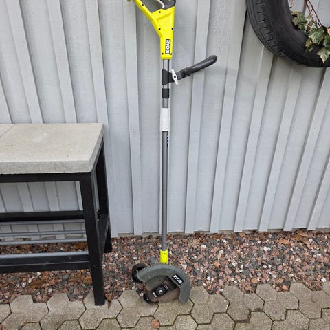 Ryobi ogräsborste batteridriven. Verktyget är avsett för rengöring av fogar och ytor utomhus, till exempel mellan plattor på uteplats eller gångar. Utrustad med teleskopiskt skaft och främre handtag för bättre ergonomi vid användning. Mycket sparsamt använd.