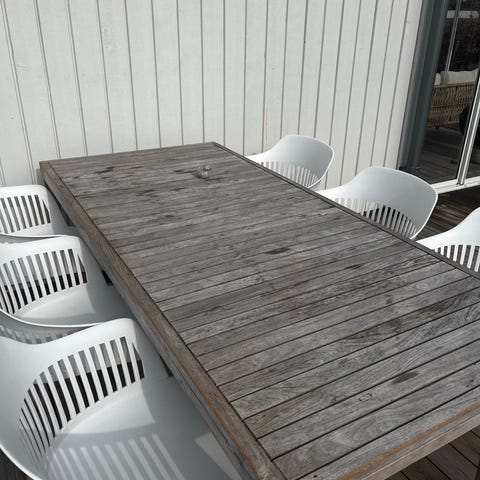 Matgrupp bestående av rektangulärt matbord och åtta stolar. Bordet är vitt med raka ben och slät bordsskiva. Stolarna är flätade i rottingstil med ljus klädsel på sitsarna. Passar exempelvis på altanen, matrum eller vardagsrum med plats för åtta sittande personer.