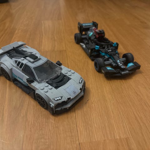 Lego Speed Champions byggset med två Mercedes-AMG bilar: Formel 1-bilen Mercedes-AMG F1 W12 och sportbilen Mercedes-AMG Project One. Setet innehåller byggbara modeller av båda bilarna med detaljerad kaross, hjul och dekaler. Flera minifigurer med hjälmar och tillbehör ingår, liksom bygginstruktioner i häften. Passar för lek och som samlarobjekt för bil- och Lego-intresserade. Legogubbarna har små avvikelser från originalversionen och en bit på den gråa bilen är ersatt med två andra men som blir identisk med originalet.