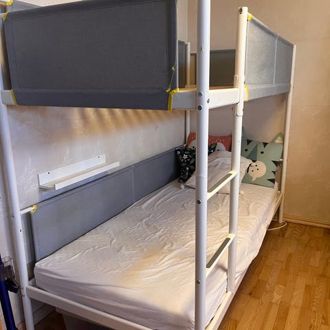 Våningssäng : struktur och sängar. Platsbyggd våningssäng säljs pga ombyggnad. Bäddmadrasser är ikea skårer 80 bredd. Kräver nedmontering. Eventuellt billigare vid snabb affär
