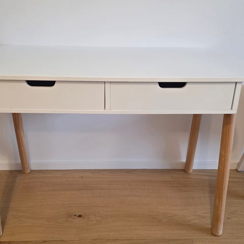 Säljer ett fint skrivbord från Jysk ”TAMHOLT” i färgen vit/natur. Skrivbordet har några små märken på bordsskivan samt att färgen på överkanten som inte tycks lackerats flagnat av men under den är färgen vit och lackerad som i övrigt, inget vi orkade reklamera efter köp och montering då det inte stör(se bild).