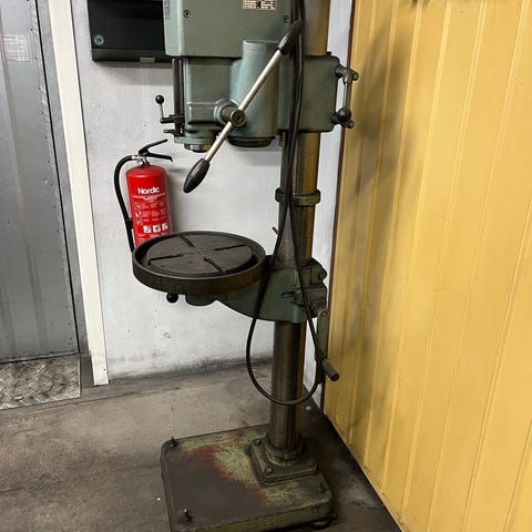Pelarborrmaskin i metall med rund, justerbar bordsskiva med spår för fastspänning av arbetsstycken. Maskinen är remdriven med remhjul under det övre locket. Utrustad med trehandtagsmatning och chuck för borr. Lämplig för borrning i metall, trä och andra material i verkstad eller garage.