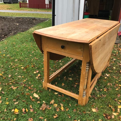 Fint soffbord med låda. Stadigt, kan fällas upp på båda sidor. Mått 100 cm långt, 49 brett, 59 högt. Klaffarna är 20 cm vardera. Finns i Knickarp utanför Blentarp.