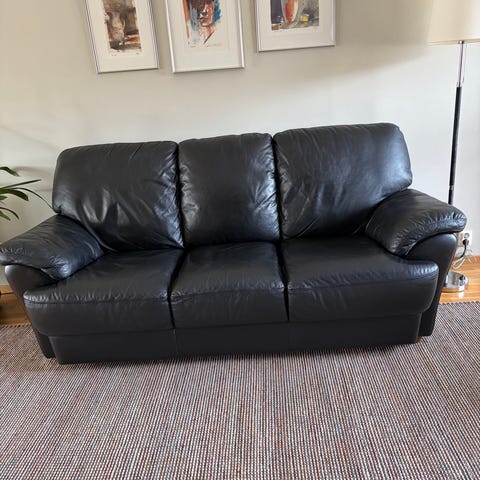 Tresitssoffa i äkta läder. Använt skick, men inget speciellt slitage att anmärka på.