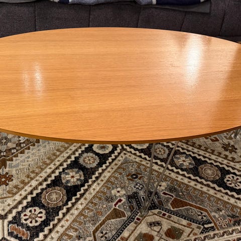 Ovalt soffbord med bordsskiva i träfaner och rund, kromad fot. Bordet har slät yta och passar som soffbord. Neutralt utförande som fungerar tillsammans med många typer av soffor och mattor. Ett välskött bord utan märken och repor.