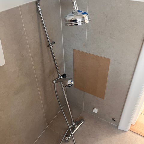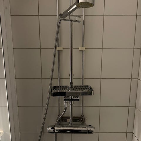 Duschset med takdusch och handdusch i kromad metall. Består av rund takdusch, justerbart duschrör, handdusch på glider samt termostatblandare. Passar för montering i duschhörna eller duschutrymme med väggfast installation. Lämligt för badrum med standard vägganslutningar för dusch.
