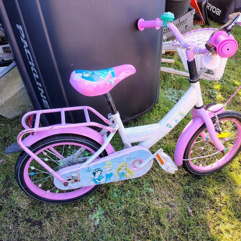 Barncykel med 16" hjul i rosa och blå färg. Cykeln har fotbroms bak och handbroms fram, stänkskärmar fram och bak samt kedjeskydd. Sadeln är mönstrad i ljusa färger. Passar barn som behöver en mindre cykel med 16-tums hjulstorlek.