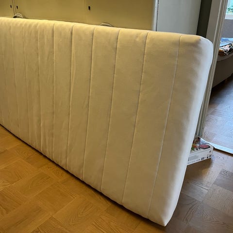 Mio sänggavel i grå sammetstyg. Gaveln har en vadderad, vertikalt vadderad design som ger ett mjukt intryck och bekvämt stöd när man sitter upp i sängen. Passar som huvudgavel mot vägg bakom säng. Färg och material gör den lätt att kombinera med olika sängramar och sovrumsinredningar. Sängkappa ingår även. Dessvärre har den ett hål i sömmen, men det är inget som syns när den sitter på. OBS katter finns i hemmet.