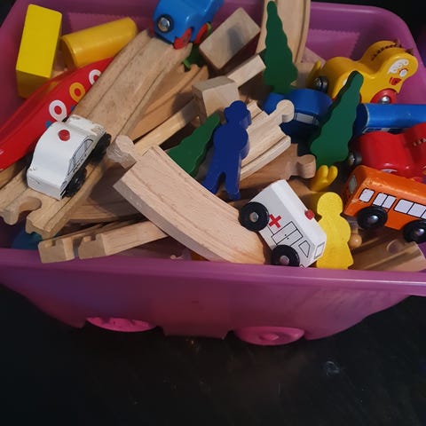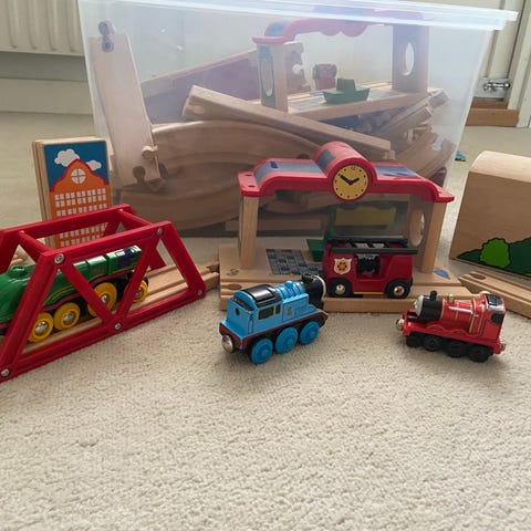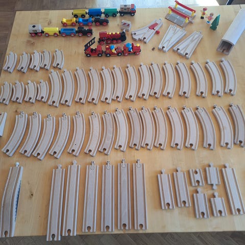 Blandat Ikea och BRIO leksaksfordon i trä som tillbehör till tågbanor. Setet består av flera olika fordon, bland annat lastbilar, traktorer, servicefordon och vagnar i olika färger. Fordonen är anpassade för BRIOs trätågbanesystem och kan kombineras med räls och andra tillbehör i samma serie. Passar för barn som leker med BRIOs tåg och vill utöka sin bana med extra fordon och vagnar.