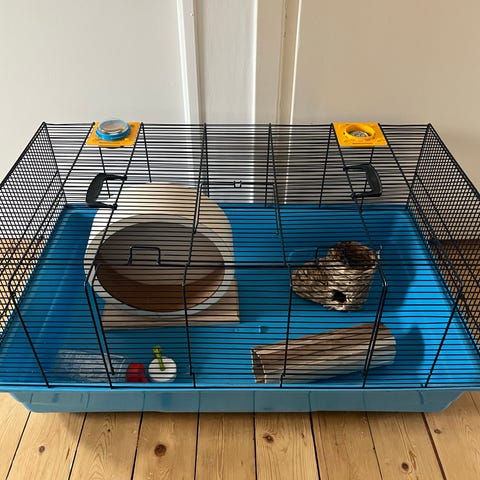 Smådjurshus med genomskinlig överdel och blå botten. Burens inredning inkluderar hjul, matskål, hus och rörsystem för klättring och lek. Passar mindre sällskapsdjur som exempelvis hamster eller liknande små gnagare.