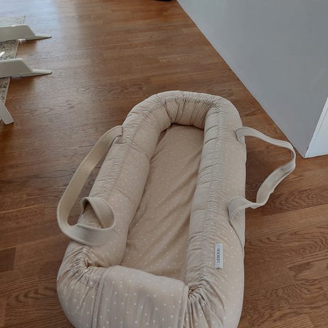 Liewood babynest i mjuk textil. Babynestet har en rosa basfärg med diskret mönster och bärhandtag på sidorna för enkel förflyttning. Kan användas som en ombonad sov- och viloplats för spädbarn i hemmet eller på resa. Yttermaterial i textil med vadderade kanter som ger en inramad liggyta för barnet.