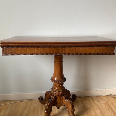Vackert antikt bord som söker nytt hem. Massivt trä och hög kvalitet på hantverk. Behöver en liten renovering för att vara användbart, ett av benen som behöver lim och träplugg för att bli stabilt igen.