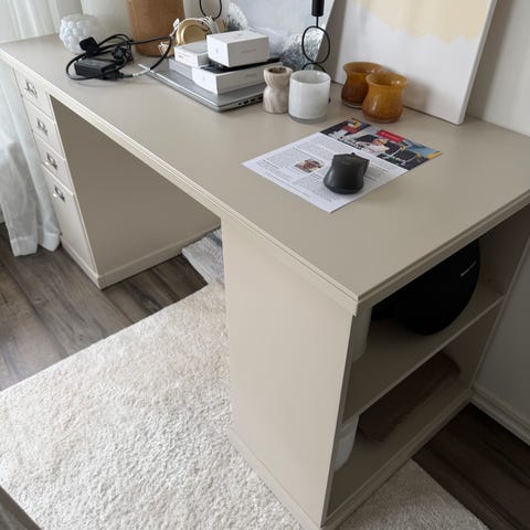 Bordet har arbetsyta med rundad framkant och en sidodel med låda och öppna hyllfack. Ovanför bordsskivan finns extra hyllplan för förvaring av böcker eller kontorsmaterial. Under bordet finns ytterligare öppna fack. Mått enligt bild: cirka 142 cm brett, 143 cm högt och 60 cm djupt. Passar som arbetsplats eller datorbord i hem eller kontor.