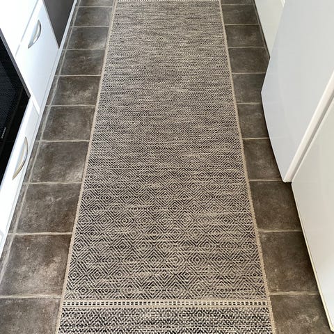 Pappelina Max gångmatta i plast med grafiskt diamantmönster.