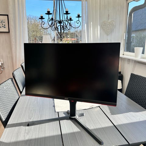 Skärmen är monterad på ett justerbart stativ som kan roteras till stående eller liggande läge.