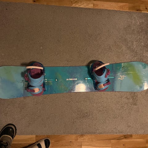 K2 snowboard med bindningar i flerfärgad design. Ena brädan har vit, röd och grå ovansida med K2‑logotyp, den andra har lila och svart ovansida med kontrastdetaljer. Båda brädorna är utrustade med monterade bindningar. Kan användas för allroundåkning i pist eller park beroende på åkarens nivå och preferens. Viss slitage syns på kanter och toppar enligt bilderna. Med pjäxor 41 / 43 hämtas Alunda