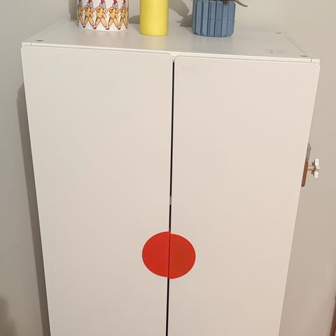 Nätt hörnskåp Ikea PS 2014 säljes. 38x38cm, 110cm högt. Laxrosa, fint skick. Benen kan skruvas bort om man vill hänga skåpet på väggen.