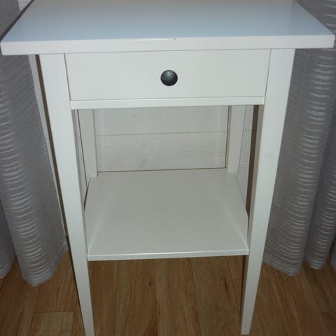 Bordet har en rektangulär bordsskiva, en utdragbar låda upptill och en öppen hylla nedtill för extra förvaring.