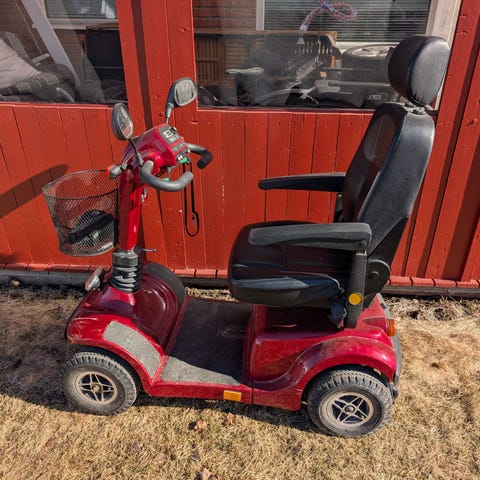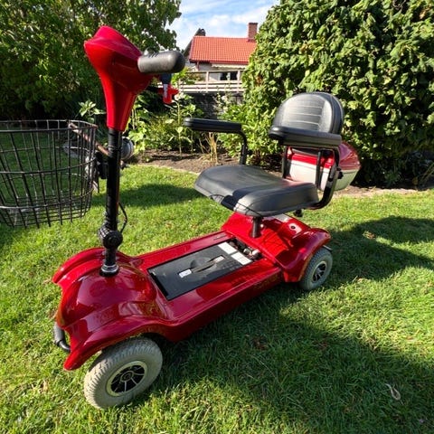 Elskoter med fyra hjul i röd färg. Utrustad med sits med armstöd, ryggstöd och fotplatta. Körreglage sitter på styret framtill. Passar för persontransport i vardagsmiljö, exempelvis inomhus eller på plana utomhusytor. Batterilåda placerad under sätet och laddkabel kan anslutas framtill vid styret. Storleken lämpar sig för en vuxen användare.