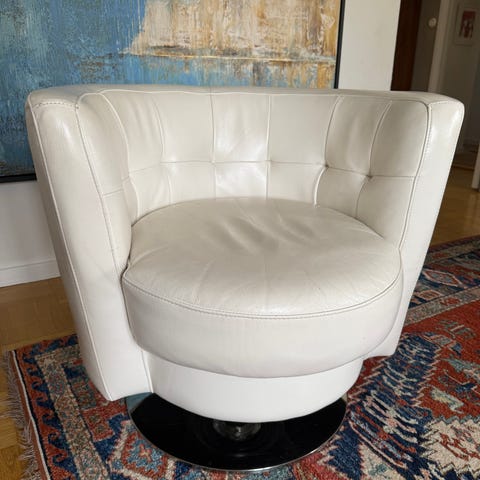 2 snurrfåtöljer i fint, grönfärgat skinn med tillhörande pallar. Använda men välvårdade av en ägare. Ryggstöd kan fällas men den ena fåtöljens reglage för fällning funkar inte. Troligtvis en vire som är av. Priset är för båda tillsammans.