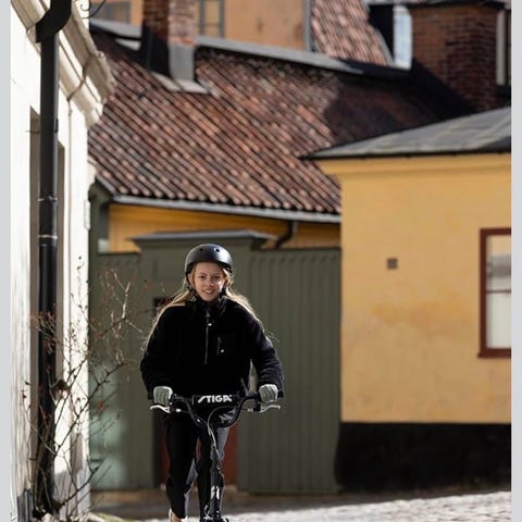De stora lufthjulen gör att Air Scootern passar för åkning på olika underlag, torra som blöta. Har handbroms för både fram- och bakhjul. Med bekvämt och stadigt cykelstöd
