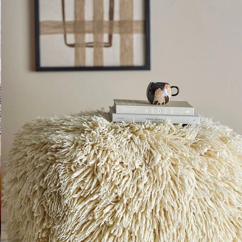Fin ullig och skön sittpuff i beige från Ellos Home. Väldigt varsamt använd, nästan som ny.