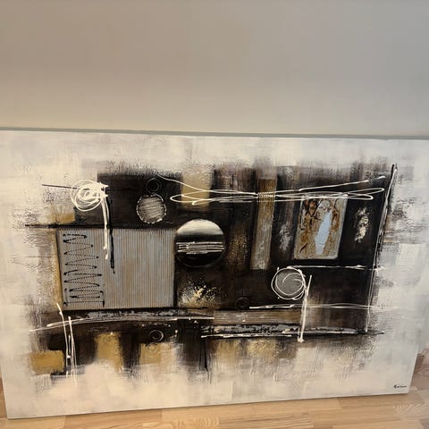Fyra avlånga tavlor som tillsammans bildar ett sammanhängande mönster med linjer och abstrakta former. Passar exempelvis i vardagsrum, hall eller kontor som väggdekoration.