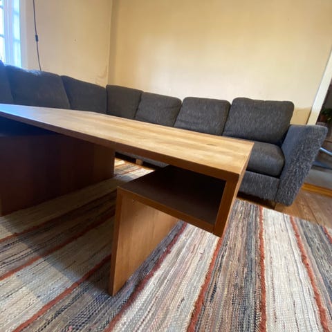 Rektangulärt bord mav MDF med mahognyfärgad mangofaner med vacker ådring. Bordsskivans undersida är av mangoträ. Den kraftiga bordsskivan med kantiga hörn matchas av två rejäla ben, ett längs vardera kortändan.