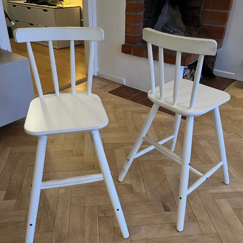 IKEA barnstolar i vit färg. Klassisk pinnstolsmodell med ryggstöd och fotstöd. Passar för barn vid matbord, pysselhörna eller i lekrum. Stolarna är utformade för inomhusbruk och har sits och ben i trä med täckande vit ytbehandling. Den ena är i bra skick, den andra har lite rangligt ryggstöd och kan behöva limmas lite.