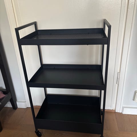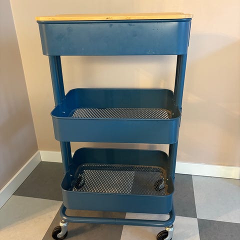 IKEA rullvagn i turkos metall med tre hyllplan. Vagnen har en öppen konstruktion med två övre hyllplan med kant runtom och ett nedre hyllplan med högre kant. Utrustad med hjul för att enkelt kunna flyttas mellan olika rum. Passar till förvaring i till exempel kök, badrum, kontor eller hobbyrum.