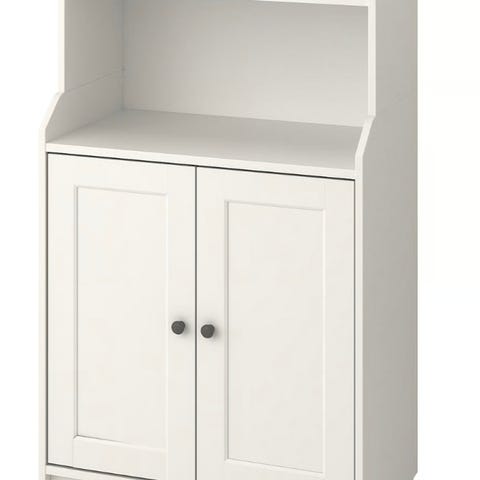 IKEA klädskåp i vit färg. Skåpet har två dörrar och en utdragbar låda längst ner. Invändigt finns flera hyllplan i trä istället för den opraktiska klädstång som är standard. Passar som förvaringsmöbel i sovrum, hall eller vardagsrum.