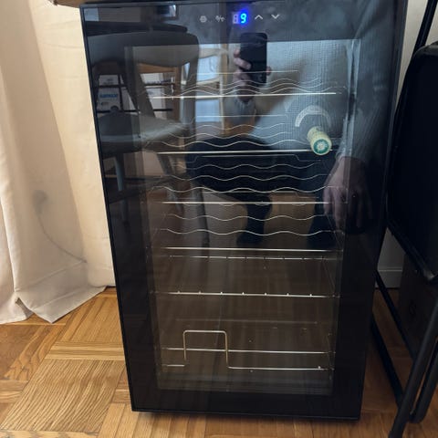 Tre hyllor i varje vinkyl och ett kylaggregat.