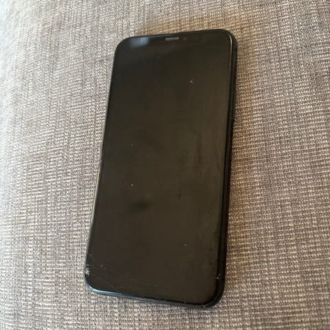 Apple iPhone Xs smartphone med 64 GB intern lagring. Modellen har helskärmsdesign med skärm som täcker nästan hela framsidan och dubbla kameror på baksidan en spricka men den gör ingen. Baksidan är i glas och ramen i metall. Färg: svart. Lämplig för vardagsanvändning som samtal, meddelanden, surf, appar, foto och video + iPhone 7 liten sprika under skärmen bredvid på knappen