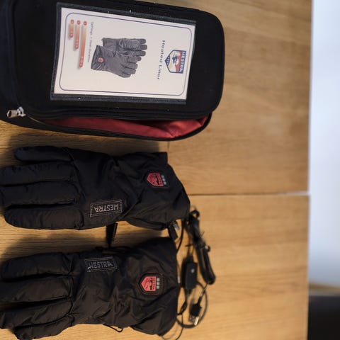 Hestra värmehandskar i storlek 11. Svarta femfingershandskar med läder i handflatan och textilmaterial på ovansidan. Justerbar rem vid handleden och snölås vid mudden. Ingår flera batterier, laddare och förvaringspåse med Hestra-logotyp. Lämpliga som vinter- eller skid-/snowboardhandskar där extra värmefunktion önskas.