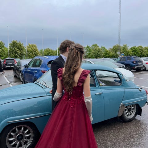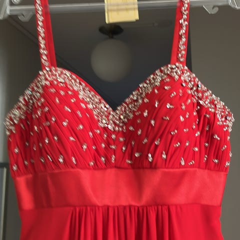 Elegant balklänning i en vacker röd nyans. Klänningen har en detaljerad spetsöverdel med paljett broderier och en smickrande off-shoulder-ringning.