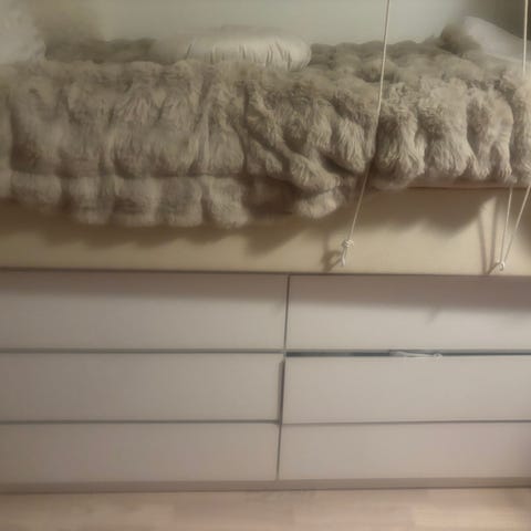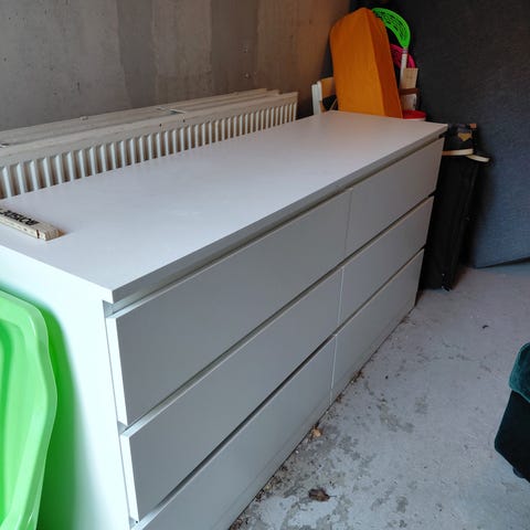 Vi har haft en säng ovanpå byrån som tyvärr skavt lite ovanpå, se bilder. I övrigt är den i gott skick.