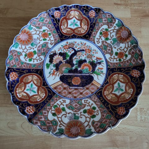 Jag säljer nu en rund Plastbricka med blå kant och blomdekor i mitten. Fatet har en bred dekorativ bård med upphöjda detaljer runt kanten och ett blommotiv i centrum. Passar som serveringsfat eller uppläggningsfat.