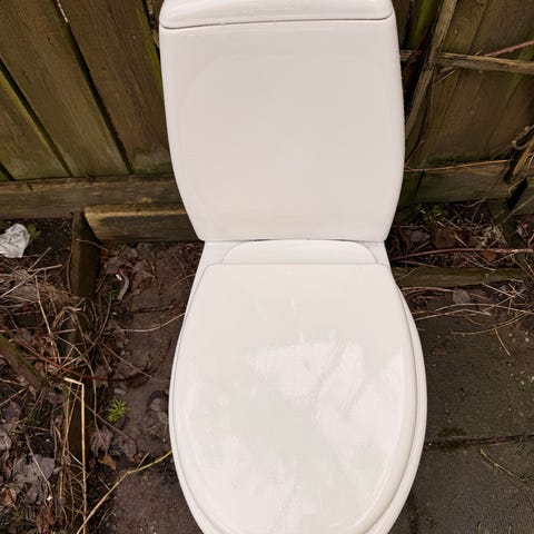 Golvstående toalettstol i vit porslin. Finns i Långasand, söder om Falkenberg