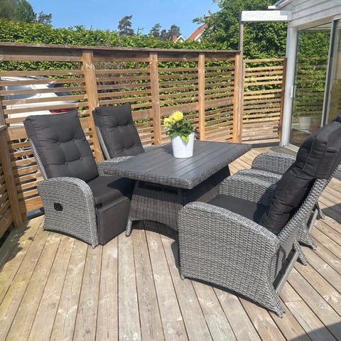 Matgrupp utomhus runt bord med 6 stolar konstrotting grå