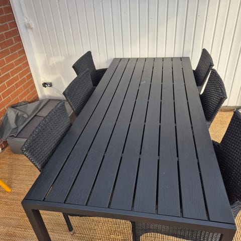Matgrupp för utomhusbruk bestående av ett rektangulärt bord och fällbara stolar. Bordet har ljus bordsskiva med ribbdesign och ben i vitt. Stolarna har mörkgrå sits och ryggstöd med mörk stomme. Passar för placering på uteplats, altan eller balkong och ger sittplatser för flera personer runt bordet.