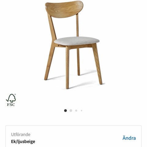 Säljer nu våra matsalstolar. De är inköpta 2025 från Åhléns. Stolarna är ekträ med fätad sits i sadelgjord. Nypris: 1599 per stol! [9594 kr totalt för alla i butik].