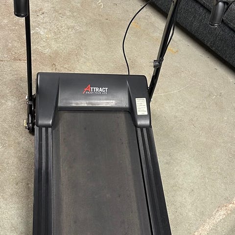 Motorspeed löpband med elektronisk display. Löpbandet har svart löpyta och vit ram med handtag utrustade med greppvänligt material. På konsolen finns digital display som visar grundläggande träningsdata samt knappar för styrning av funktioner. Passar för gång och lättare löpträning inomhus i hem- eller hobbygym.