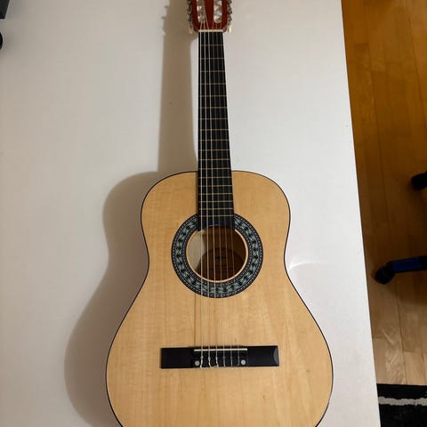 Akustisk klassisk gitarr i naturfärg med nylonsträngar. Gitarren har hel kropp i trä, greppbräda med bandmarkeringar och huvud med sex stämskruvar. Passar för spel i hemmet, övning och enklare framträdanden. Lämplig för både nybörjare och mer erfarna spelare som vill ha en klassisk akustisk gitarrmodell.