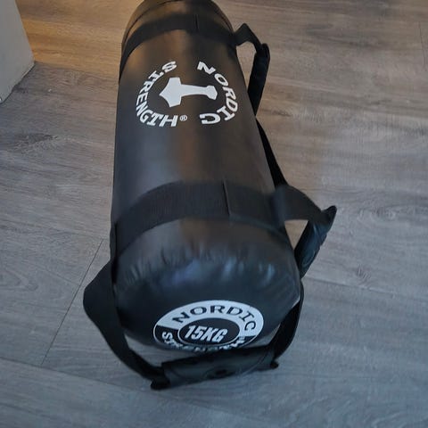 Boxningssäck med kedjor och väggfäste i svart färg. Ett stabilt väggfäste i metall ingår.