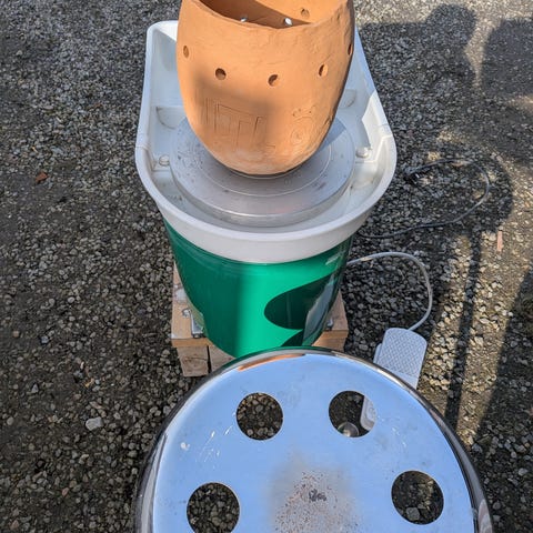 Röda hinkstyltor i plast med snören